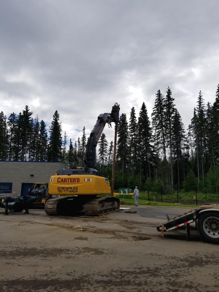 우리 회사는 미니 포크레인을 가지고 있다. 이번 시공에는 탑의 기초 공사로 Screw pile(스크류 파일 : 땅속에 봉을 심는 기초공사) 시공을 하기 때문에 협력 업체에서 어미 포크레인을(Screw pile drive를 장착했다) 싣고 왔다. 크기가 어마어마 하다.